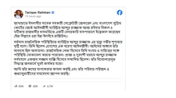 অনলাইন ডেস্ক : বাংলাদেশ জামায়াতে ইসলামীর সাবেক সহকারী সেক্রেটারি জেনারেল ও সুপ্রিম কোর্টের জ্যেষ্ঠ আইনজীবী ব্যারিস্টার আব্দুর রাজ্জাকের মৃত্যুতে শোক জানিয়েছেন বিএনপির ভারপ্রাপ্ত চেয়ারম্যান তারেক রহমান। রবিবার (৪ মে) এক